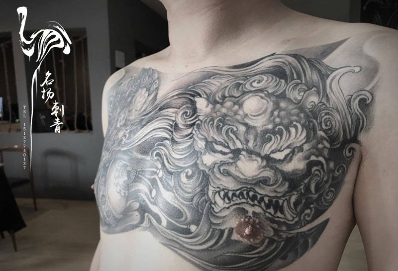当前位置: 首页 >河北省沧州市纹身店-名扬刺青工作室纹身图案>富贵双狮纹身图片_胸部新传统纹身图案