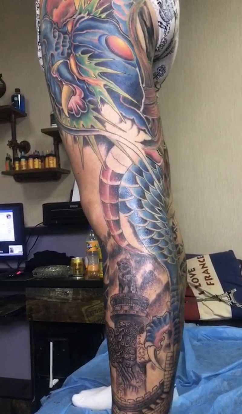 • T网红王老大花腿龙纹身图片_腿部新传统纹身图案