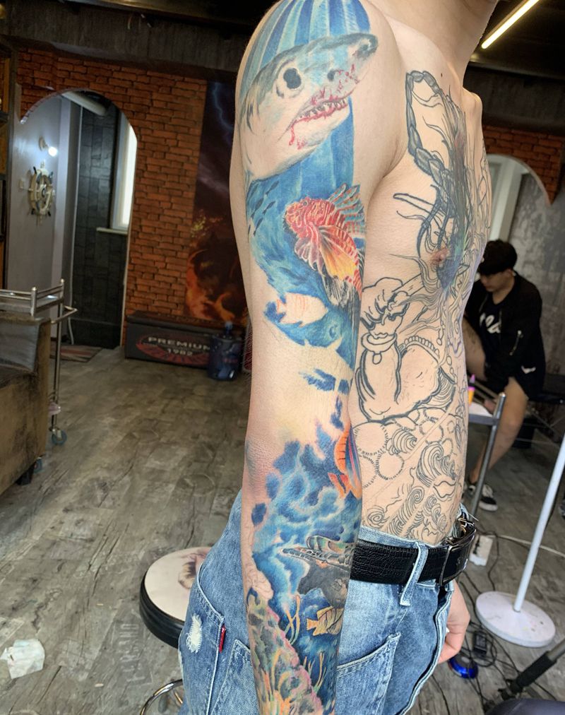 当前位置: 首页 >河北省沧州市纹身店-神龍刺青纹身店纹身图案>海底世界纹身图片_手臂欧美写实欧美重彩纹身图案