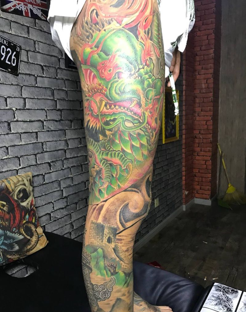 • T网红王老大花腿龙纹身图片_腿部新传统纹身图案