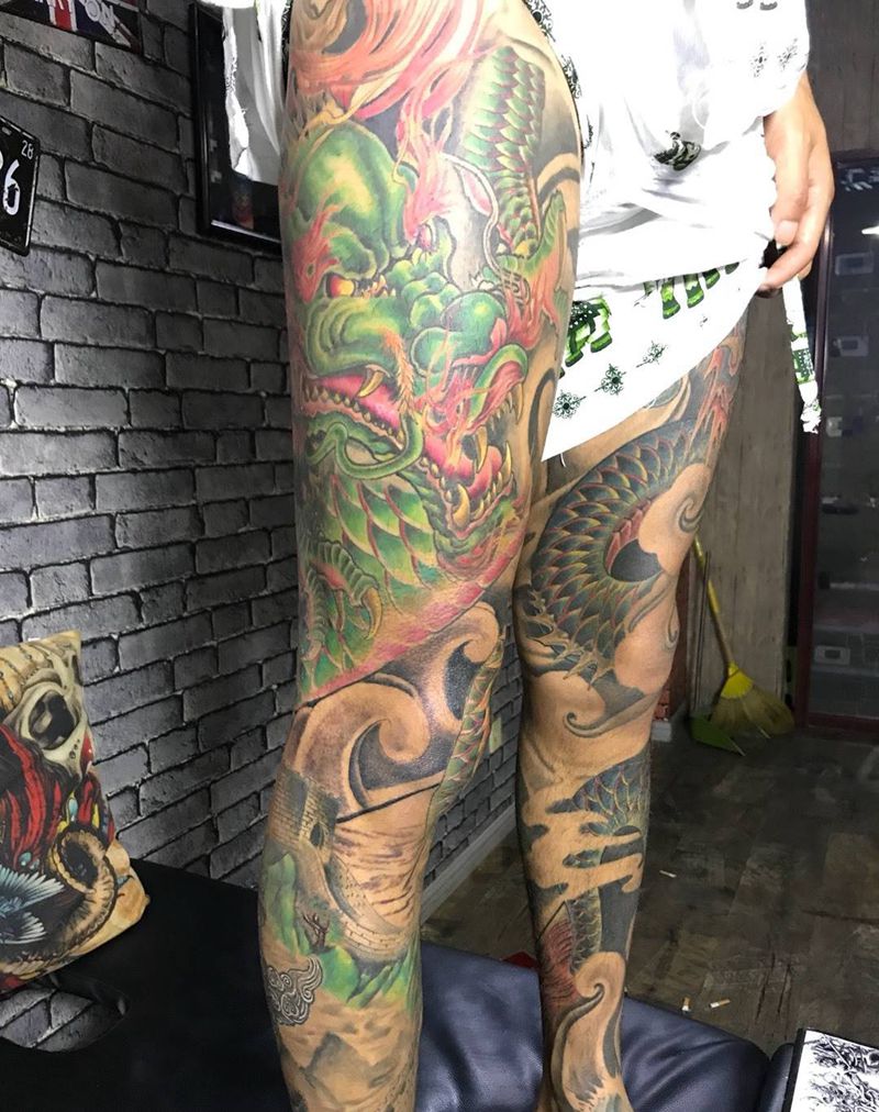 • T网红王老大花腿龙纹身图片_腿部新传统纹身图案