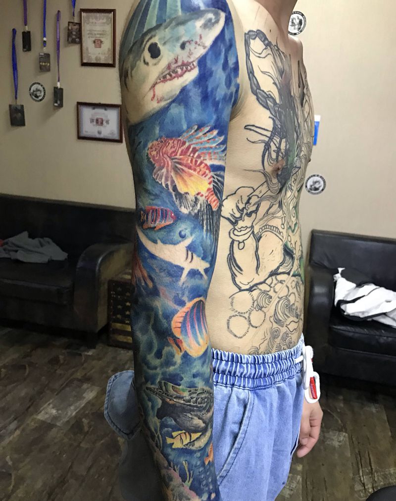 当前位置: 首页 >河北省沧州市纹身店-神龍刺青纹身店纹身图案>海洋世界大体纹身图片_手臂欧美写实New School纹身图案