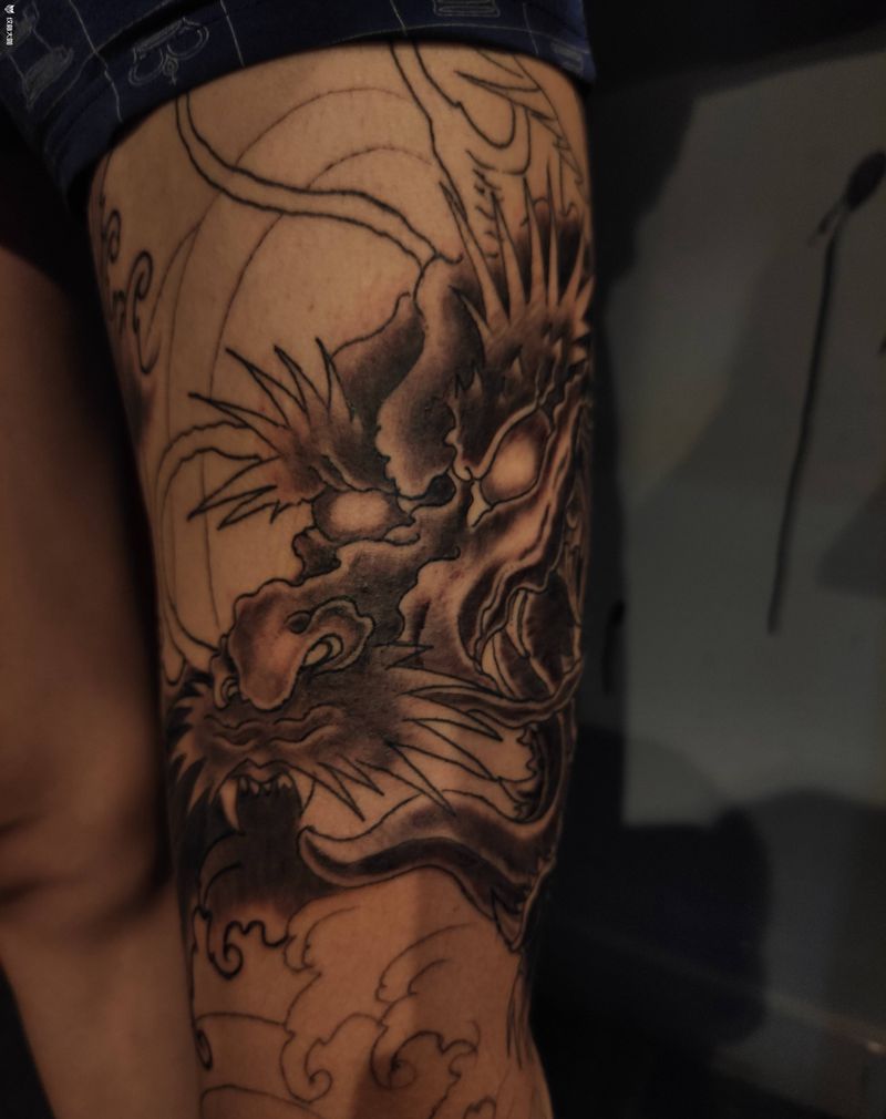 • T网红王老大花腿龙纹身图片_腿部新传统纹身图案