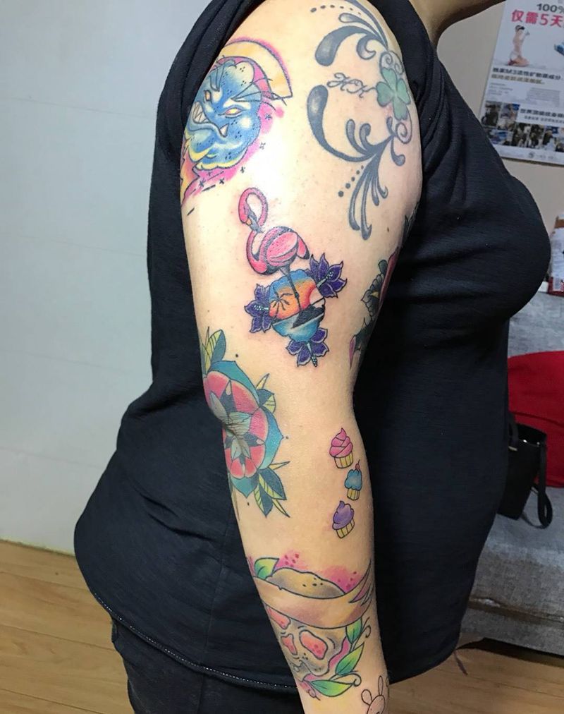 当前位置: 首页 >河北省廊坊市纹身店-天工刺青纹身图案>彩色拼接花臂纹身图片