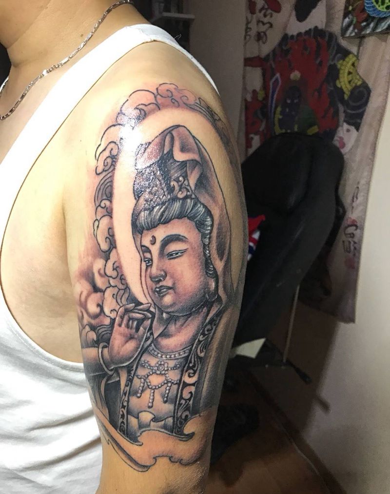 当前位置: 首页 >河北省廊坊市纹身店-天工刺青纹身图案>文殊菩萨纹身图片