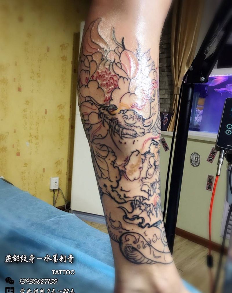 • T网红王老大花腿龙纹身图片_腿部新传统纹身图案
