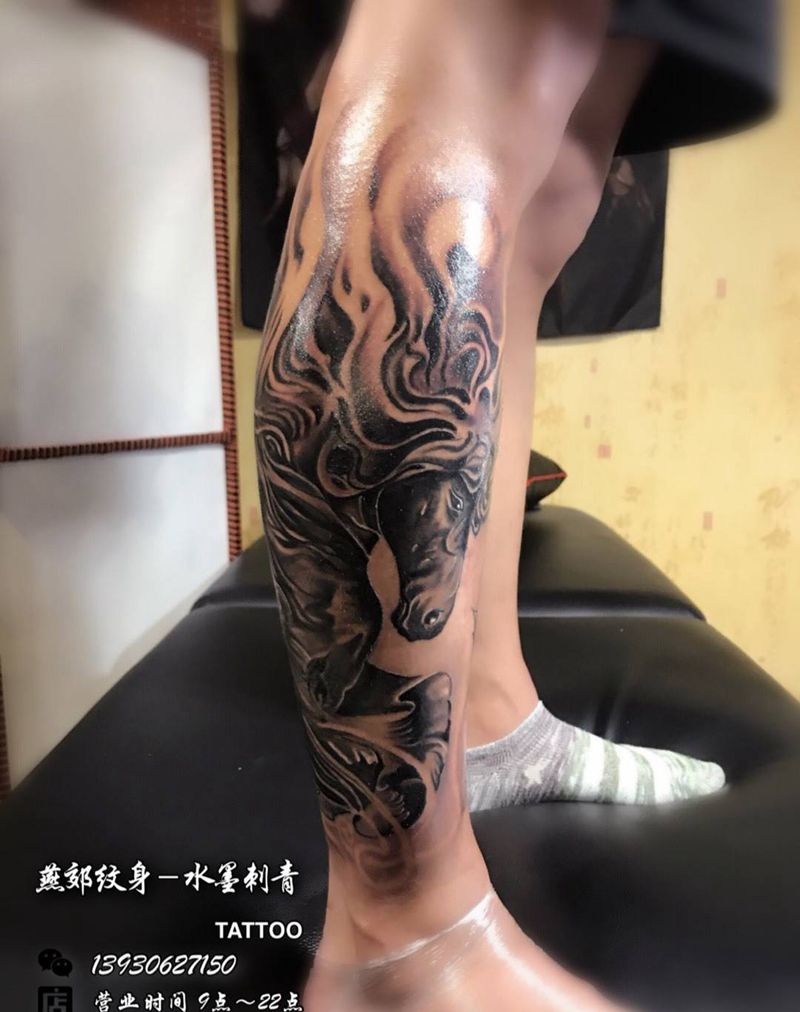 马纹身图片_成品腿部欧美动物植物静物纹身图案