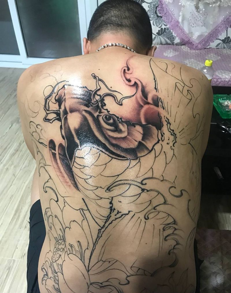 天天养鱼……未完成纹身图片_背部传统动物纹身图案