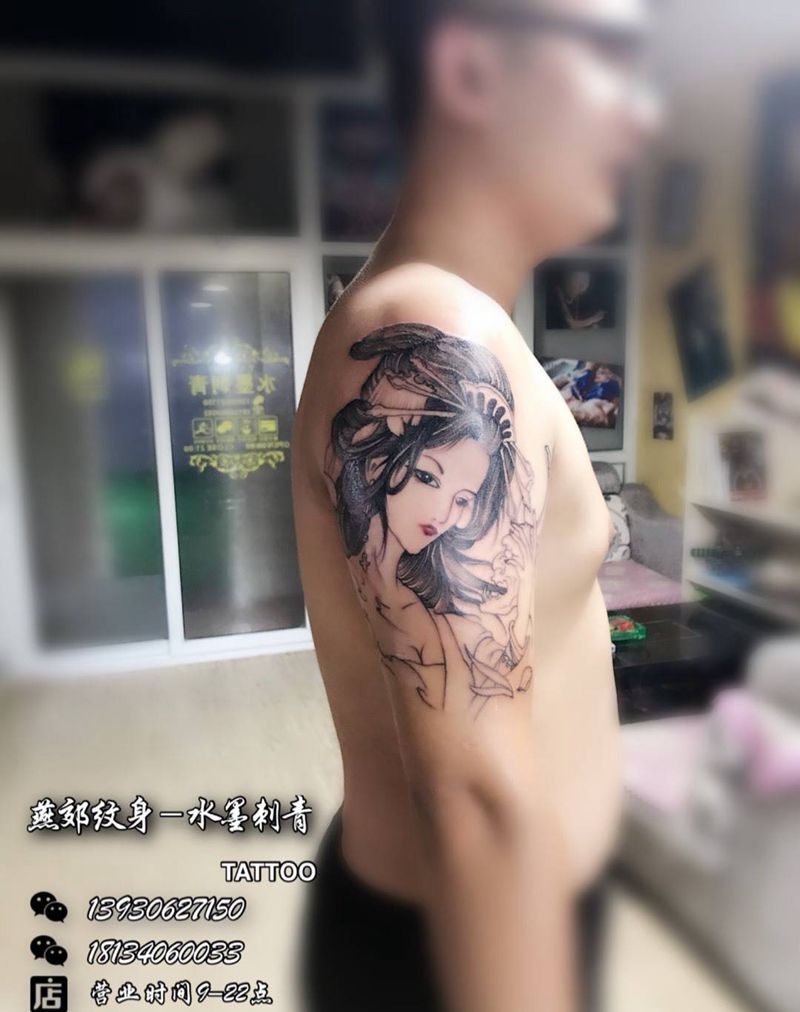 当前位置: 首页 >河北省廊坊市纹身店-祥Tattoo燕郊店纹身图案>艺伎纹身图片_肩部手臂传统人物纹身图案