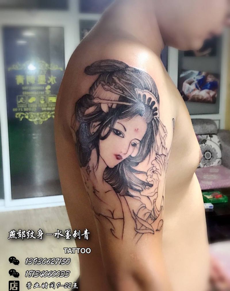 当前位置: 首页 >河北省廊坊市纹身店-祥Tattoo燕郊店纹身图案>艺伎纹身图片_肩部手臂传统人物纹身图案