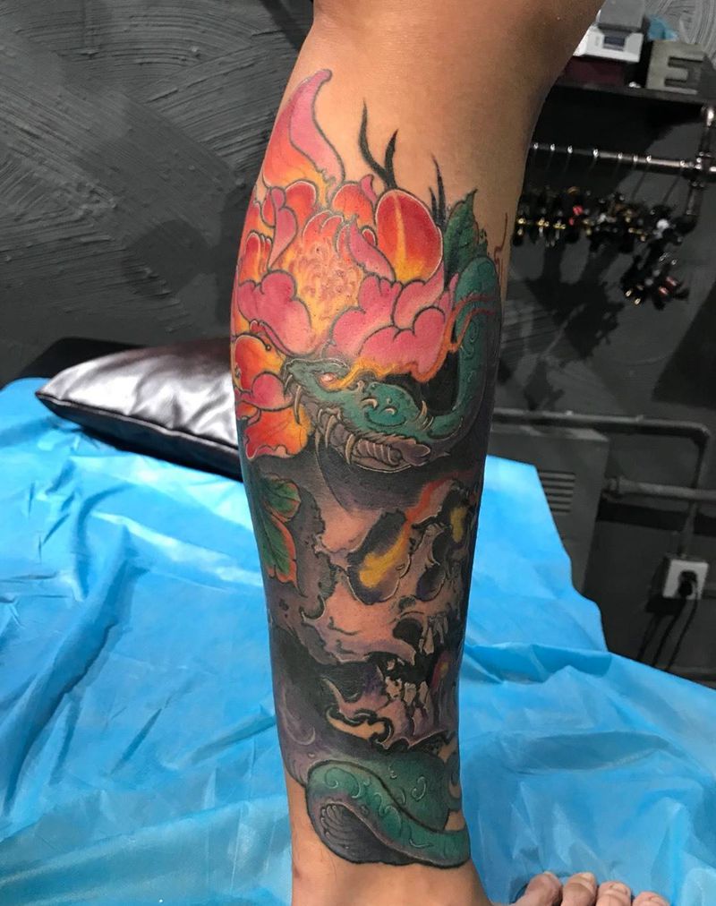 当前位置: 首页 >河北省廊坊市纹身店-祥Tattoo燕郊店纹身图案>枯骨与蛇纹身图片_成品腿部传统动物植物静物鬼神纹身图案
