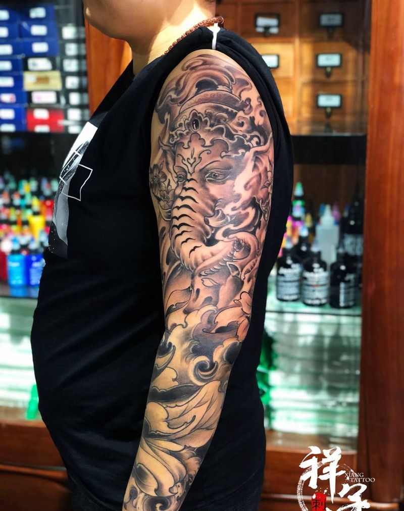 当前位置: 首页 >河北省廊坊市纹身店-祥Tattoo燕郊店纹身图案>又见象神纹身图片_成品肩部手臂传统鬼神动物静物纹身图案
