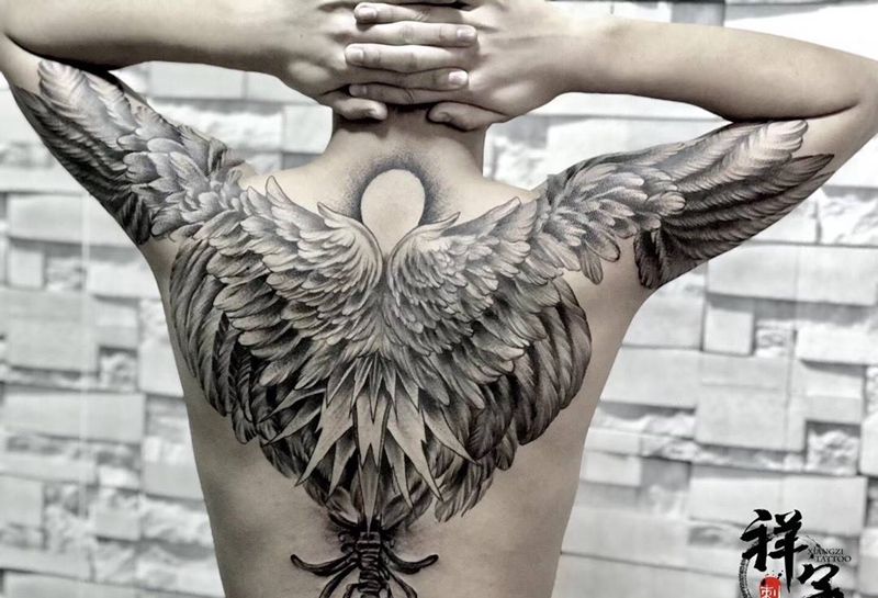 翅膀纹身图片_背部手臂欧美写实新传统纹身图案