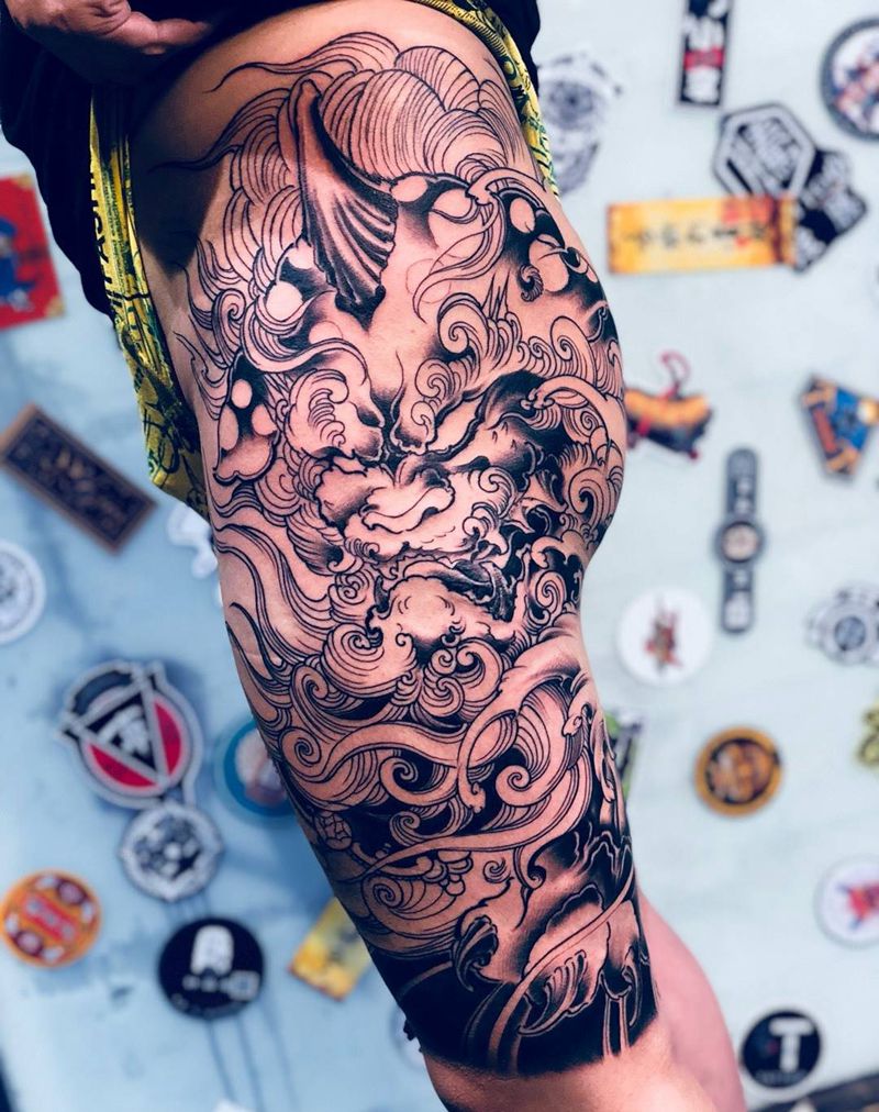 • T网红王老大花腿龙纹身图片_腿部新传统纹身图案