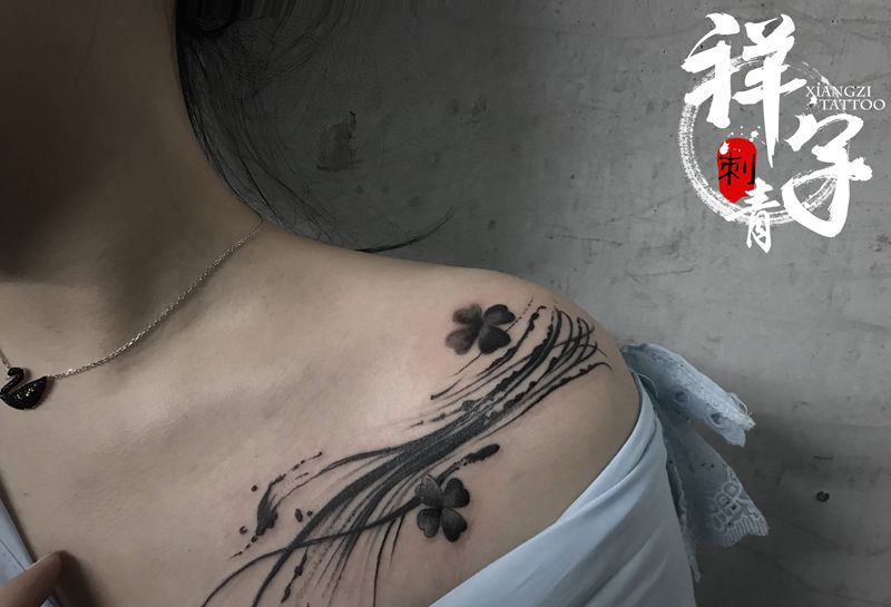 幸运纹身图片_肩部颈部水墨四叶草纹身图案