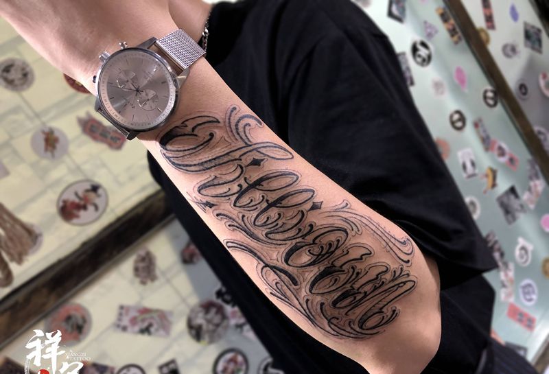 当前位置: 首页 >河北省廊坊市纹身店-祥Tattoo燕郊店纹身图案>手绘花体字纹身图片_手臂花体字纹身图案
