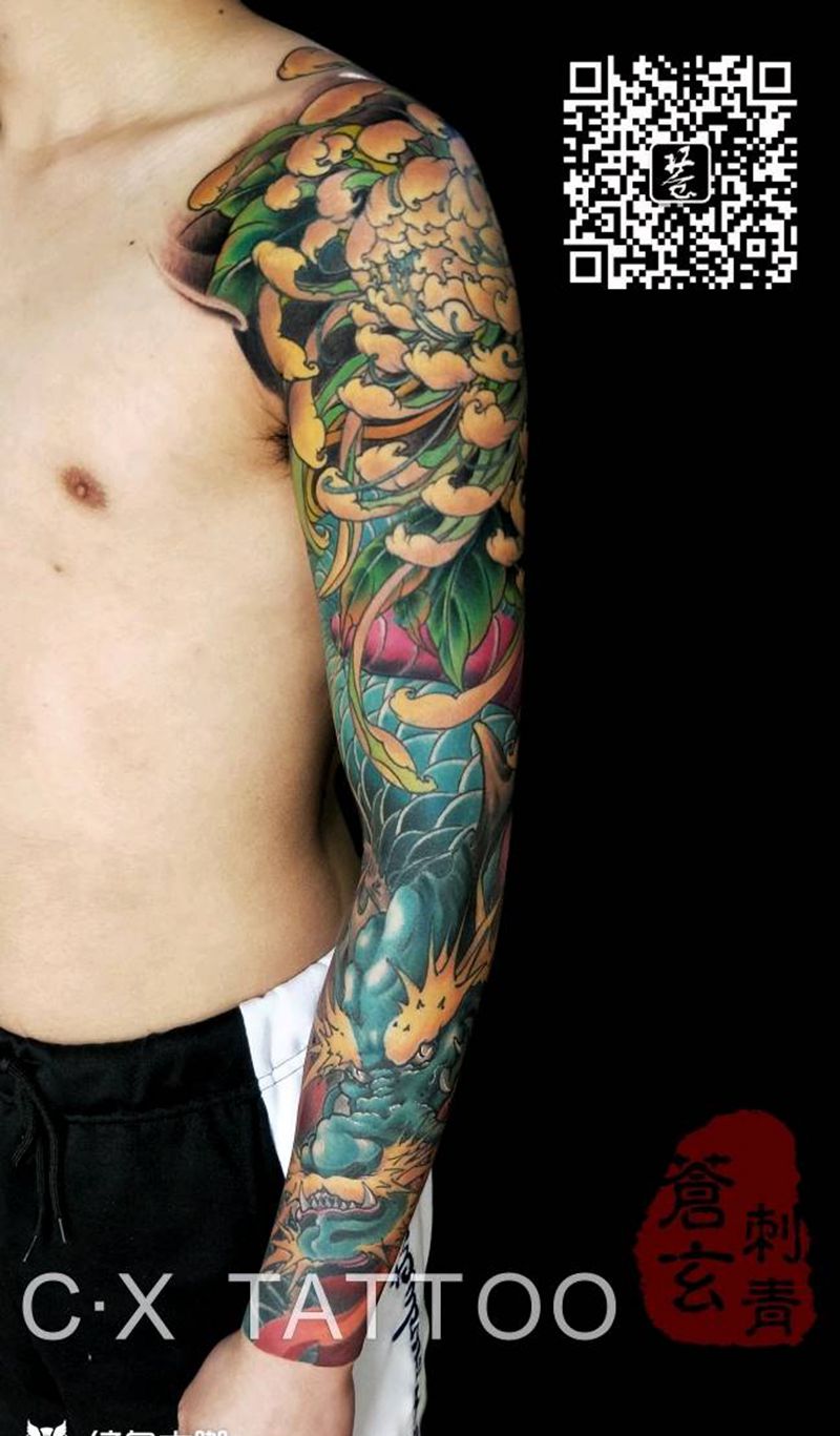 一条龙纹身图片_手臂腿部新传统老传统龙花臂重彩纹身图案