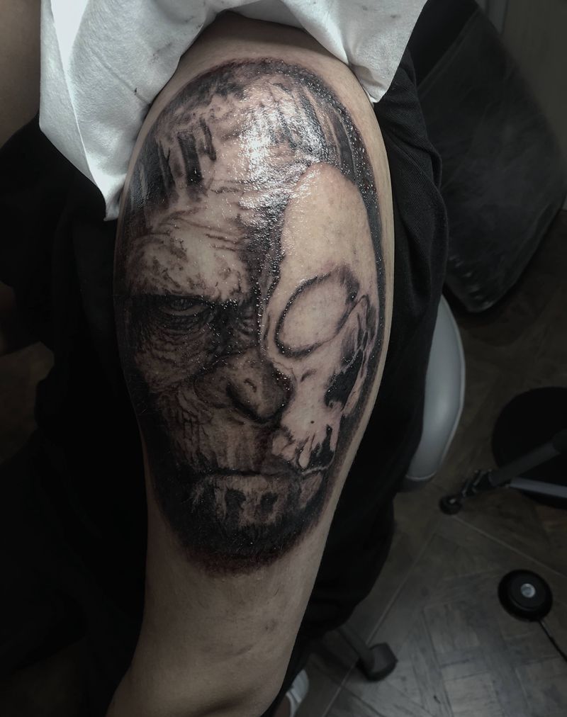 当前位置: 首页 >河北省沧州市纹身店-入墨刺青纹身图案>猩球崛起纹身图片_肩部欧美写实猩猩骷髅钟表纹身图案