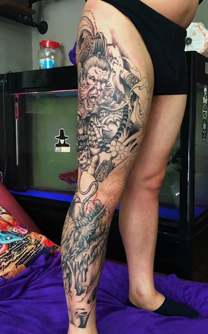 • T网红王老大花腿龙纹身图片_腿部新传统纹身图案
