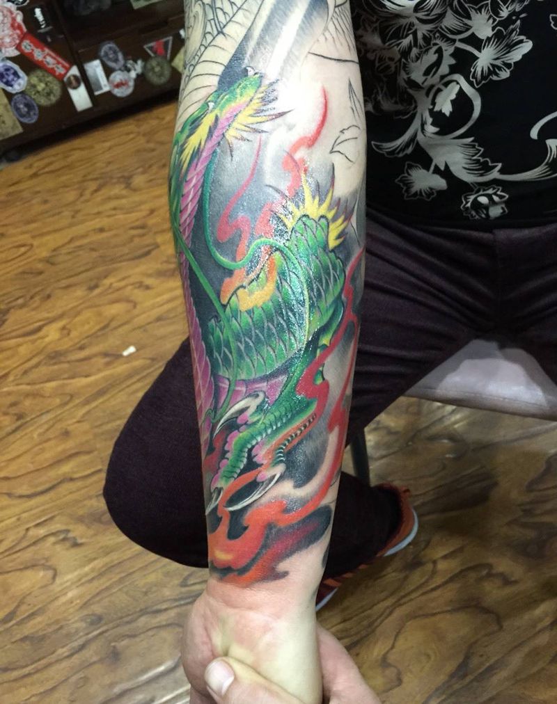• T网红王老大花腿龙纹身图片_腿部新传统纹身图案