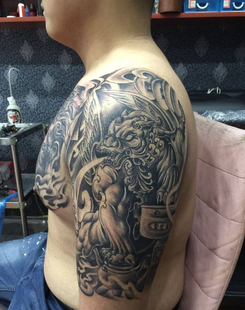 当前位置: 首页 >河北省廊坊市纹身店-藝健堂刺青团队纹身图案>明王 貔貅半胛纹身图片