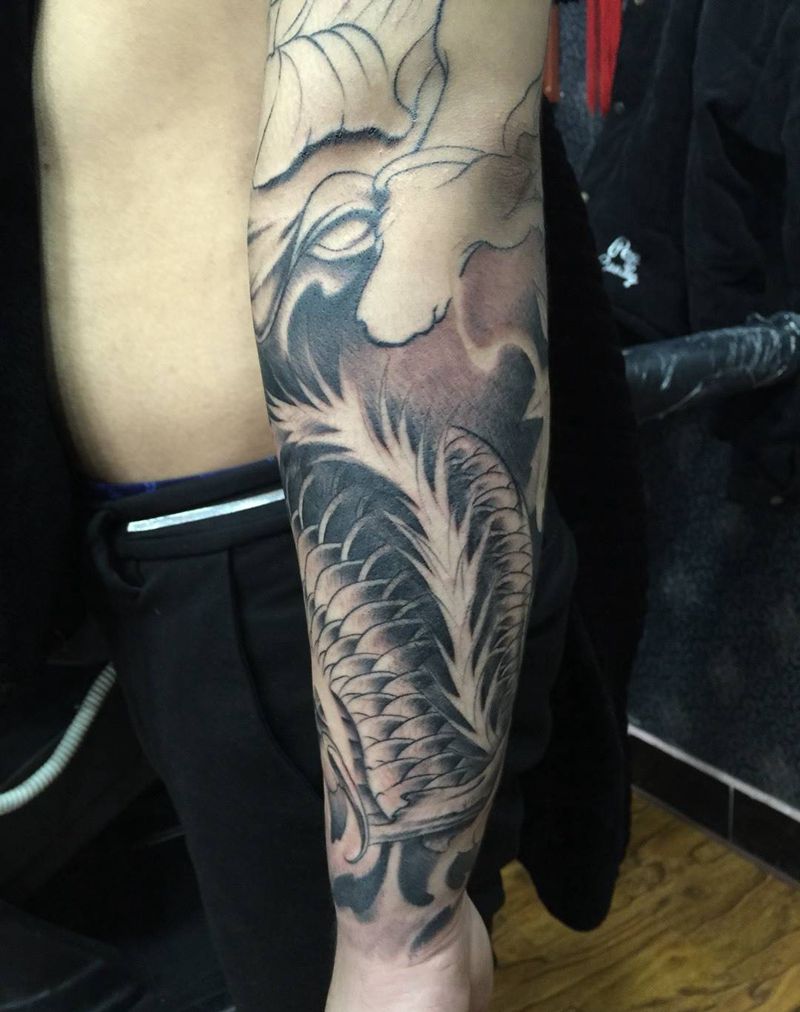 • T网红王老大花腿龙纹身图片_腿部新传统纹身图案