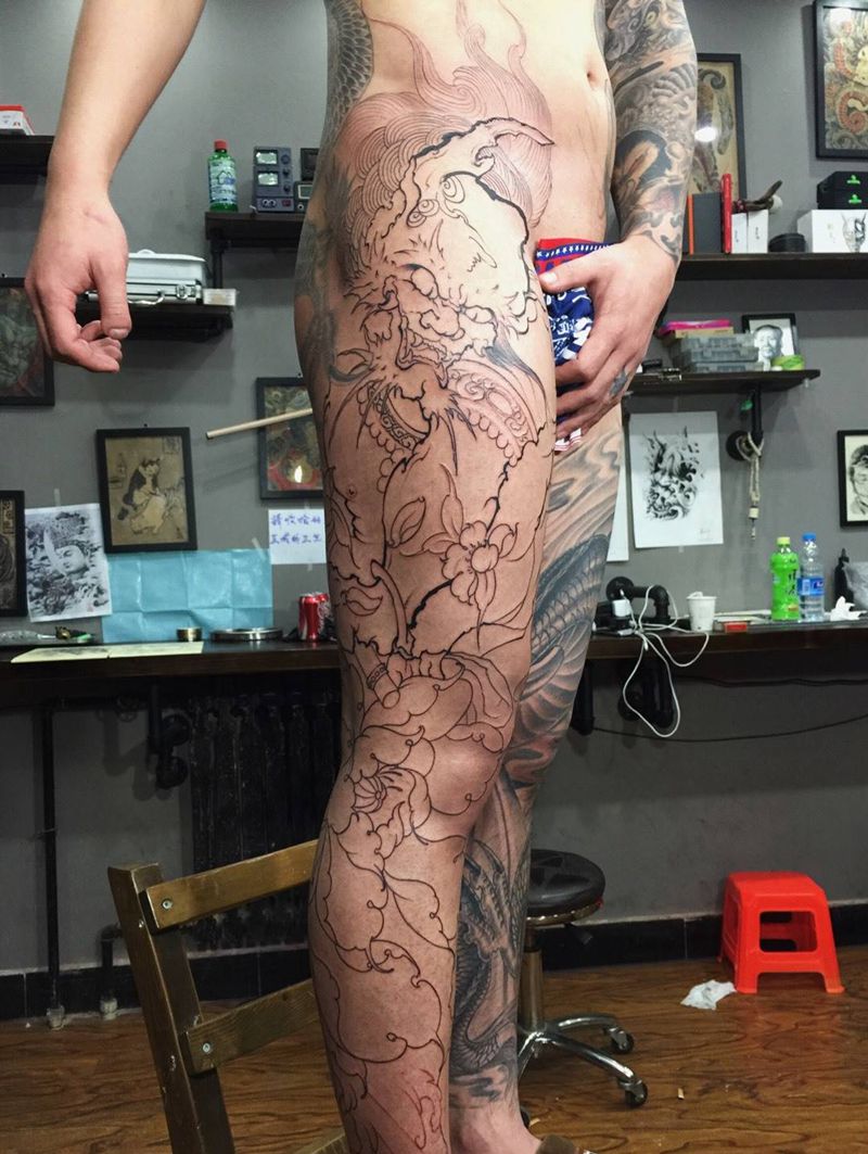 • T网红王老大花腿龙纹身图片_腿部新传统纹身图案