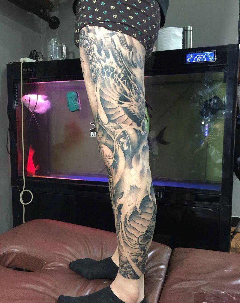 • T网红王老大花腿龙纹身图片_腿部新传统纹身图案