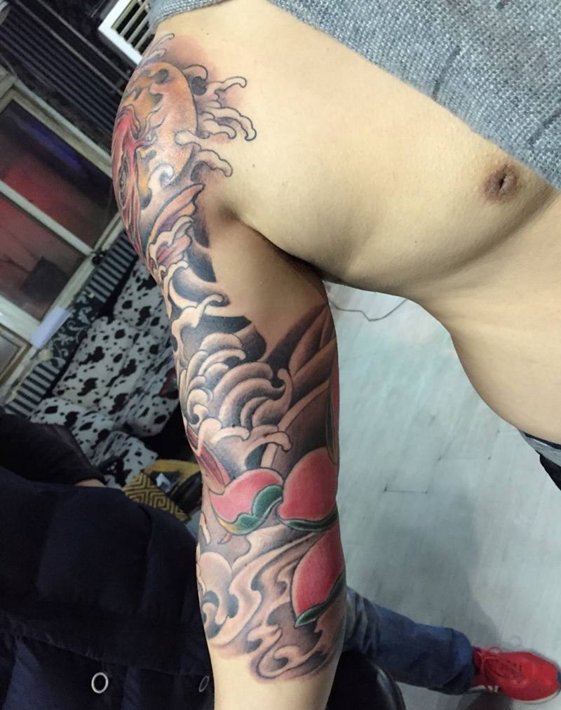 当前位置: 首页 >河北省廊坊市纹身店-西界刺青纹身图案>彩色七分袖纹身图片_手臂成品传统纹身图案