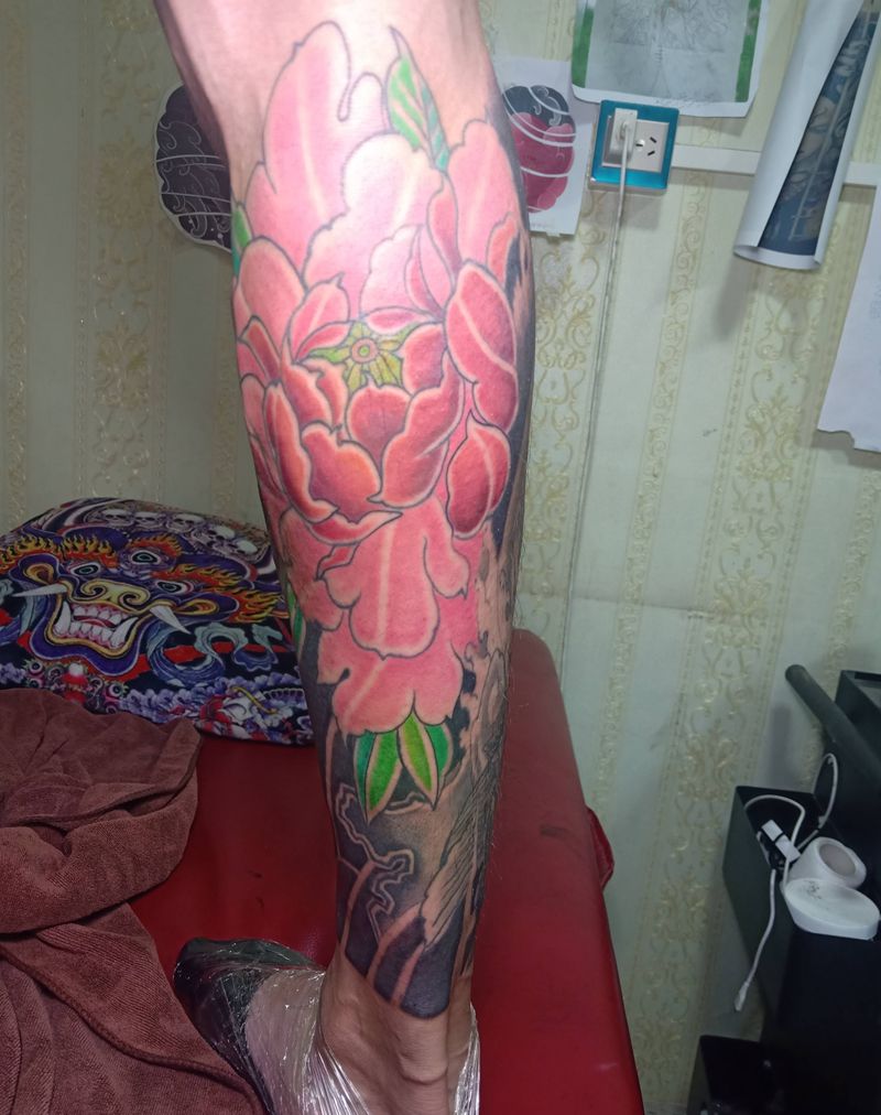 牡丹纹身图片_腿部新传统纹身图案