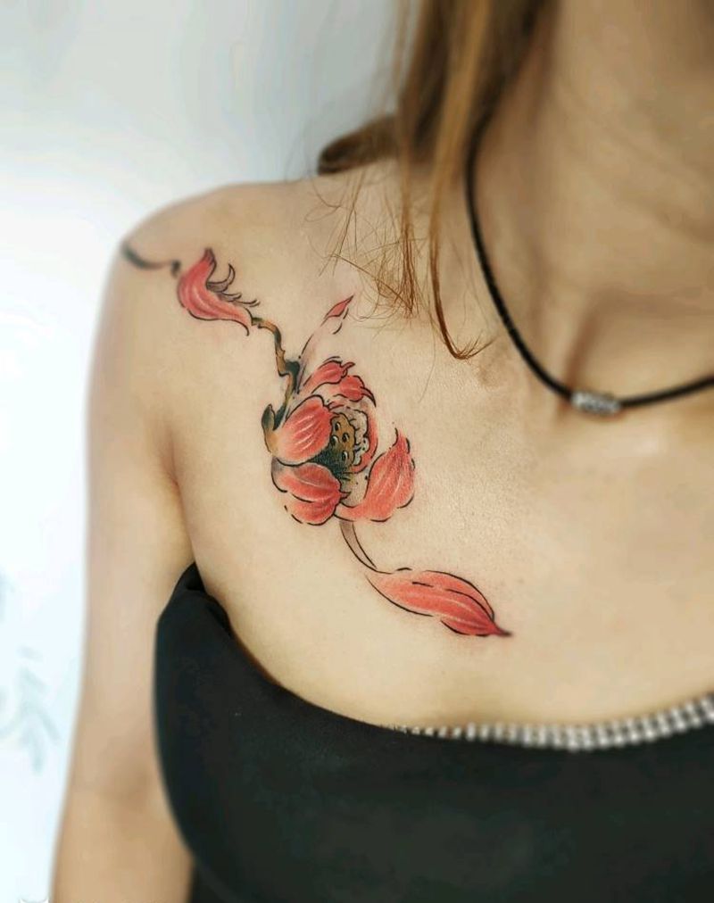 荷花遮盖纹身图片_肩部颈部新传统水彩荷花遮盖莲花纹身图案