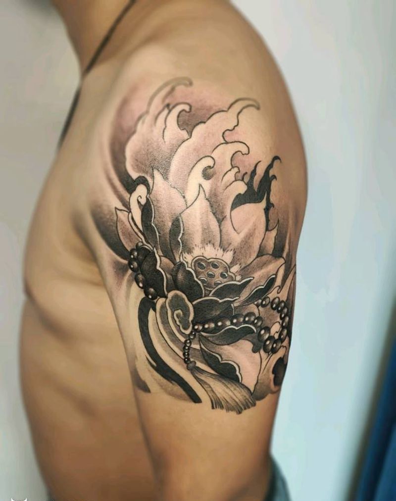 大臂传统荷花纹身图片_肩部手臂新传统老传统荷花莲花佛珠纹身图案