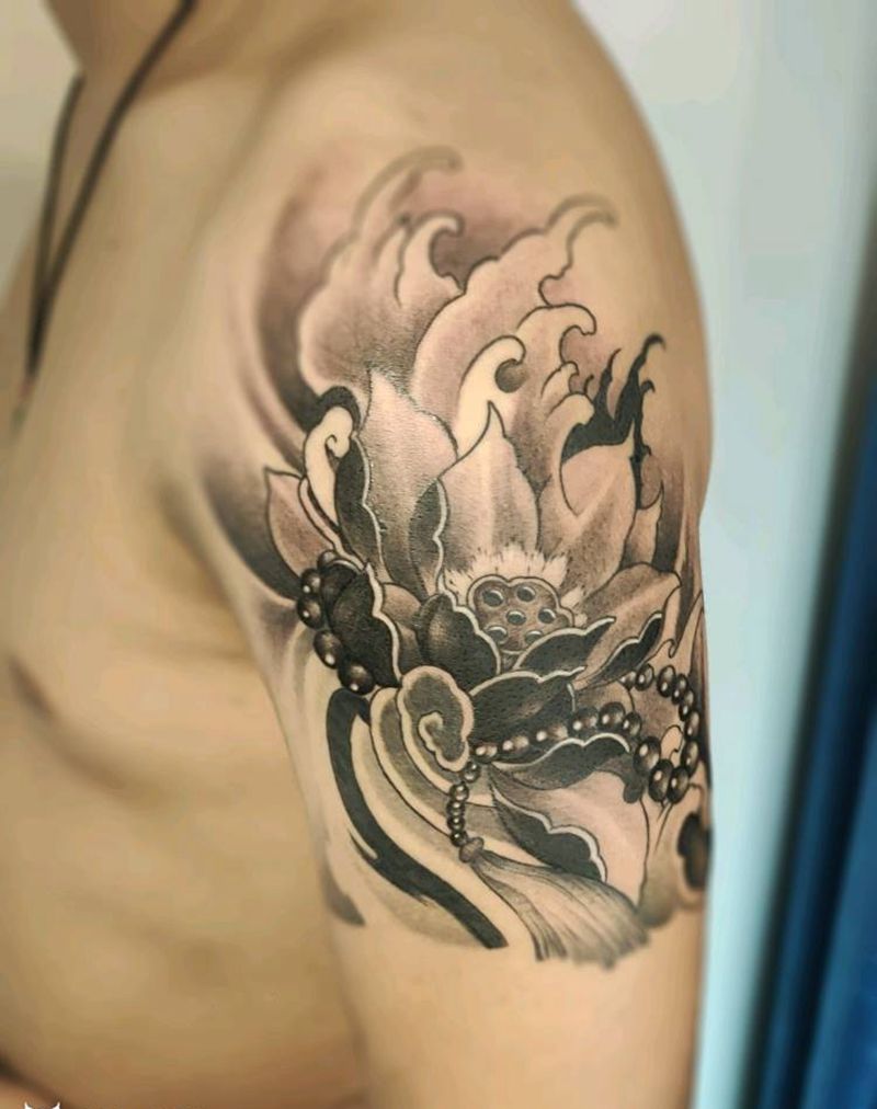 大臂传统荷花纹身图片_肩部手臂新传统老传统荷花莲花佛珠纹身图案