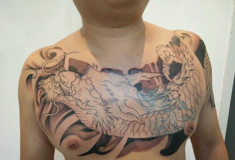 花胸龙遮盖纹身图片_胸部手臂传统动物鬼神遮盖纹身图案
