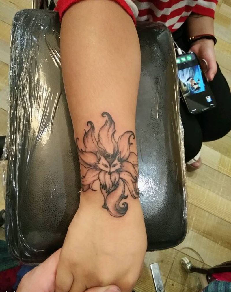 当前位置: 首页 >河北省廊坊市纹身店-妖舞刺青纹身图案>小九尾狐纹身图片_手部手臂新传统欧美写实九尾狐狐狸纹身图案