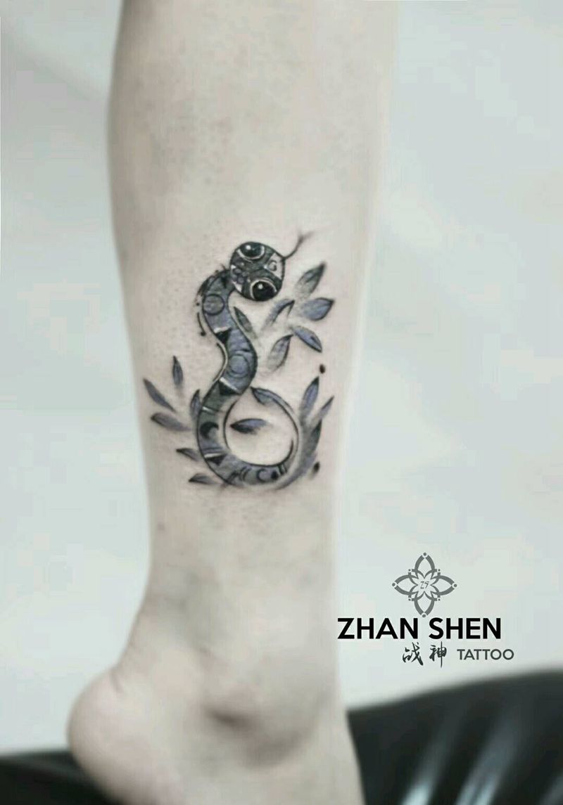 小蛇纹身图片_脚部腿部水彩水墨蛇纹身图案