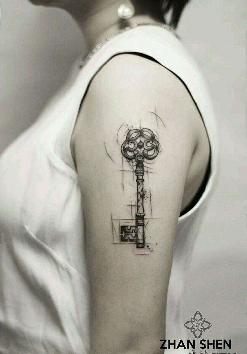 钥匙纹身纹身图片_手臂肩部欧美写实水墨钥匙纹身纹身图案