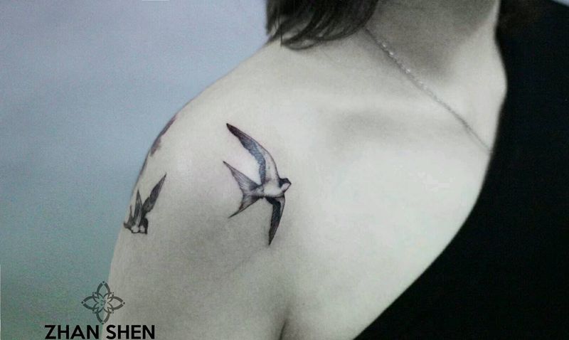 自由的而且有依靠纹身图片_胸部肩部欧美写实水墨树燕子纹身图案