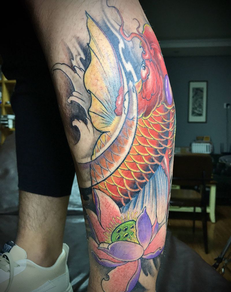 当前位置: 首页 >河北省廊坊市纹身店-飞墨刺青纹身图案>锦鲤纹身图片_腿部新传统锦鲤鲤鱼纹身图案