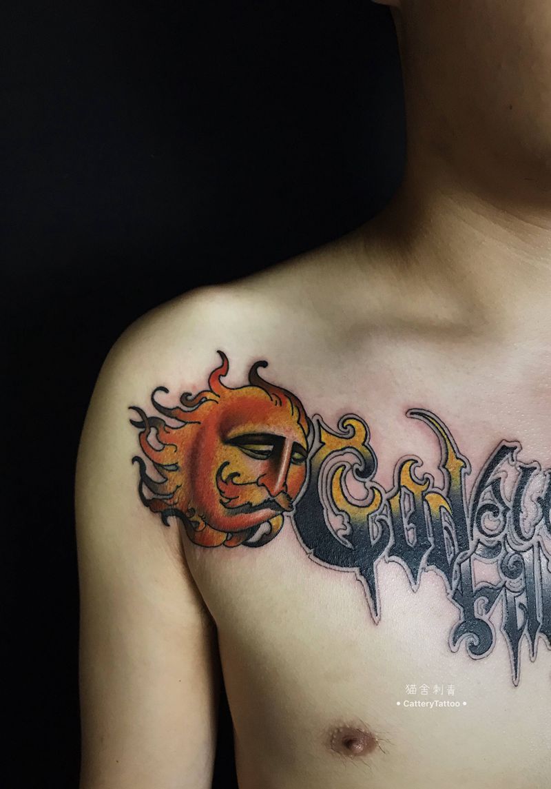 当前位置: 首页 >河北省衡水市纹身店-猫舍刺青纹身图案>花胸纹身图片_肩部胸部花体字纹身图案