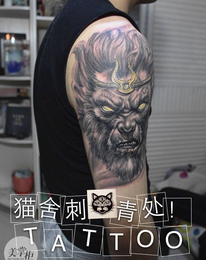 当前位置: 首页 >河北省衡水市纹身店-猫舍刺青纹身图案>黑暗悟空纹身图片_欧美肖像写实人物鬼神手臂纹身图案