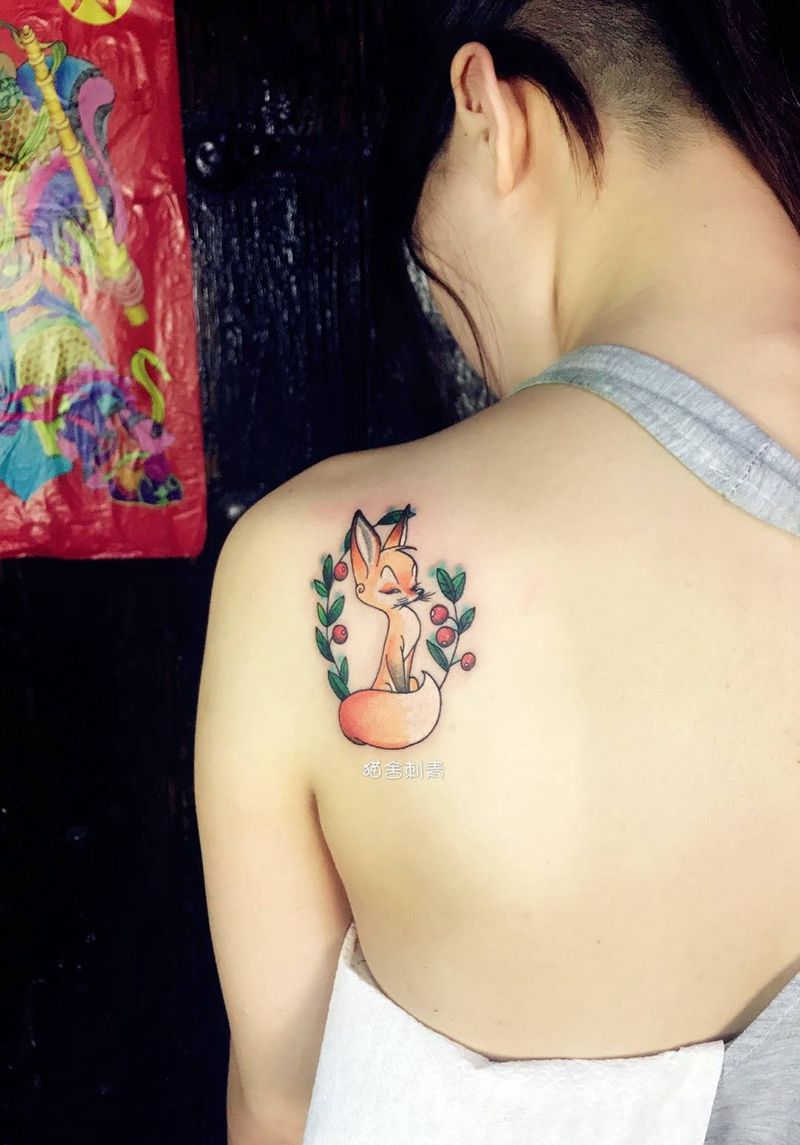 小狐狸纹身图片_成品手稿插画肩部清新写实动物静物原创纹身图案