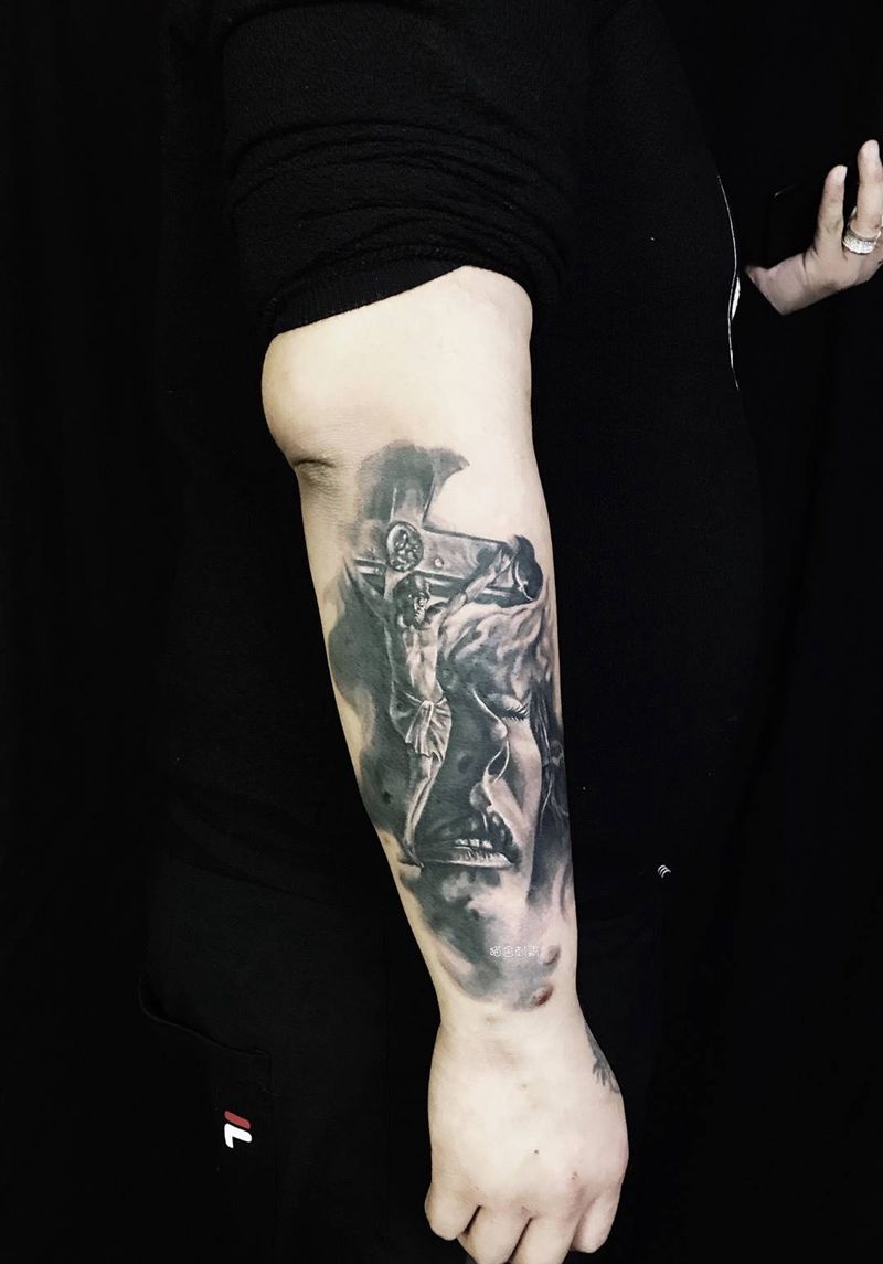 当前位置: 首页 >河北省衡水市纹身店-猫舍刺青纹身图案>信仰纹身图片_成品手稿手部手臂欧美写实人物原创宗教纹身图案