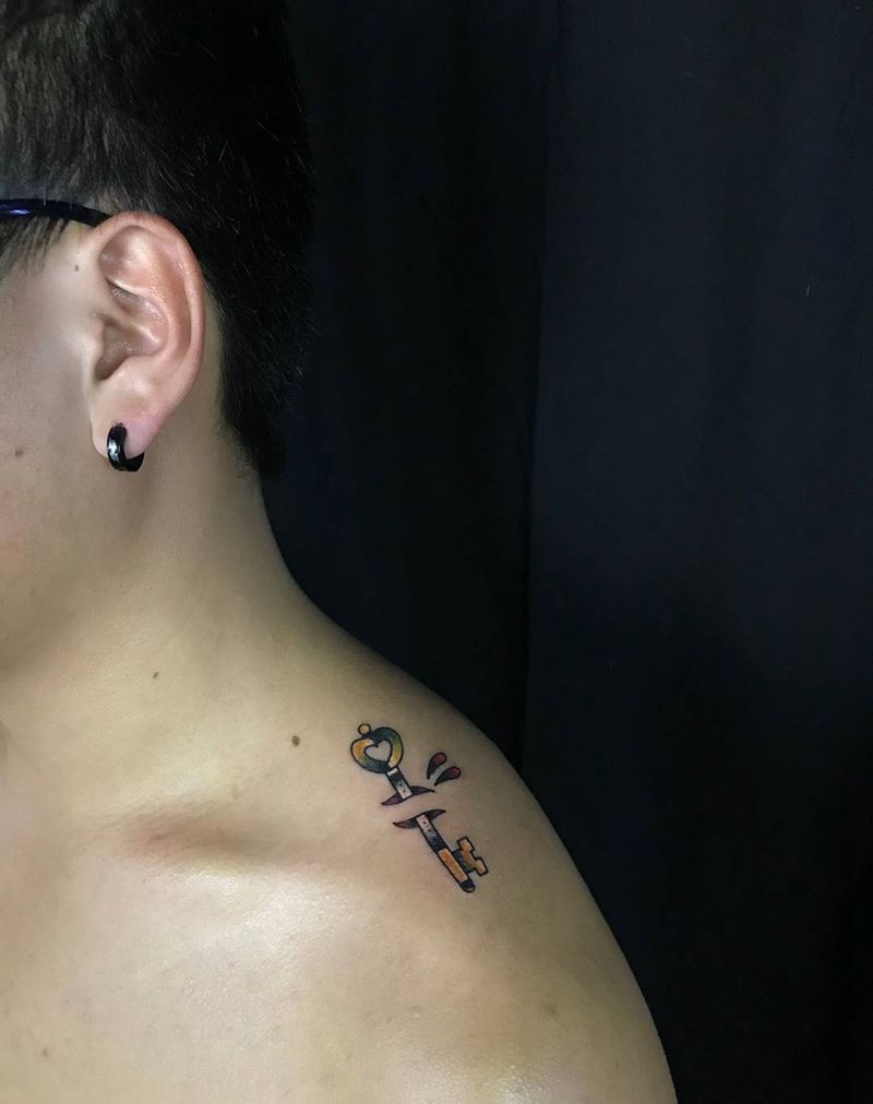 钥匙纹身图片_成品手稿颈部肩部欧美清新传统静物几何纹身图案