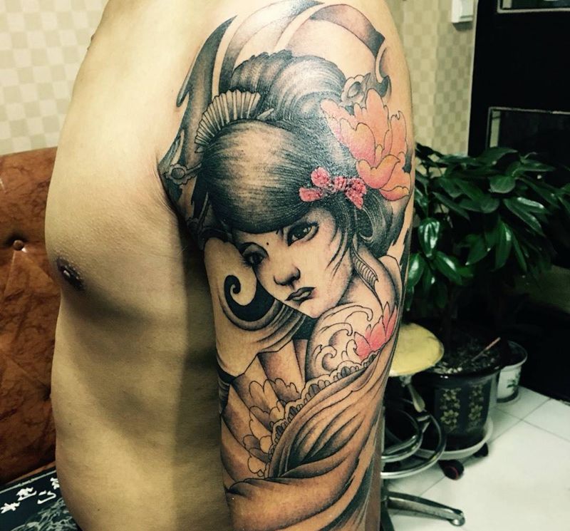 当前位置: 首页 >山西省太原市纹身店-太原御墨刺青纹身图案>大臂艺妓纹身图片