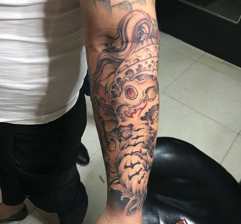 当前位置: 首页 >山西省太原市纹身店-太原御墨刺青纹身图案>小臂象神纹身图片
