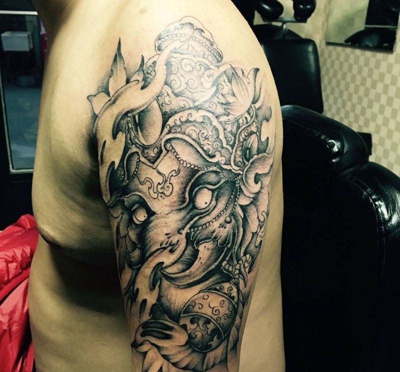 当前位置: 首页 >山西省太原市纹身店-太原御墨刺青纹身图案>大臂象神纹身图片