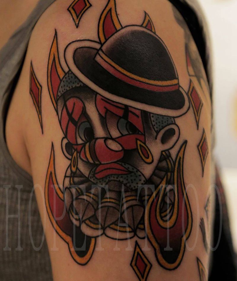 当前位置: 首页 >山西省太原市纹身店-太原琥珀刺青纹身图案>小丑纹身图片_手臂Old School纹身图案