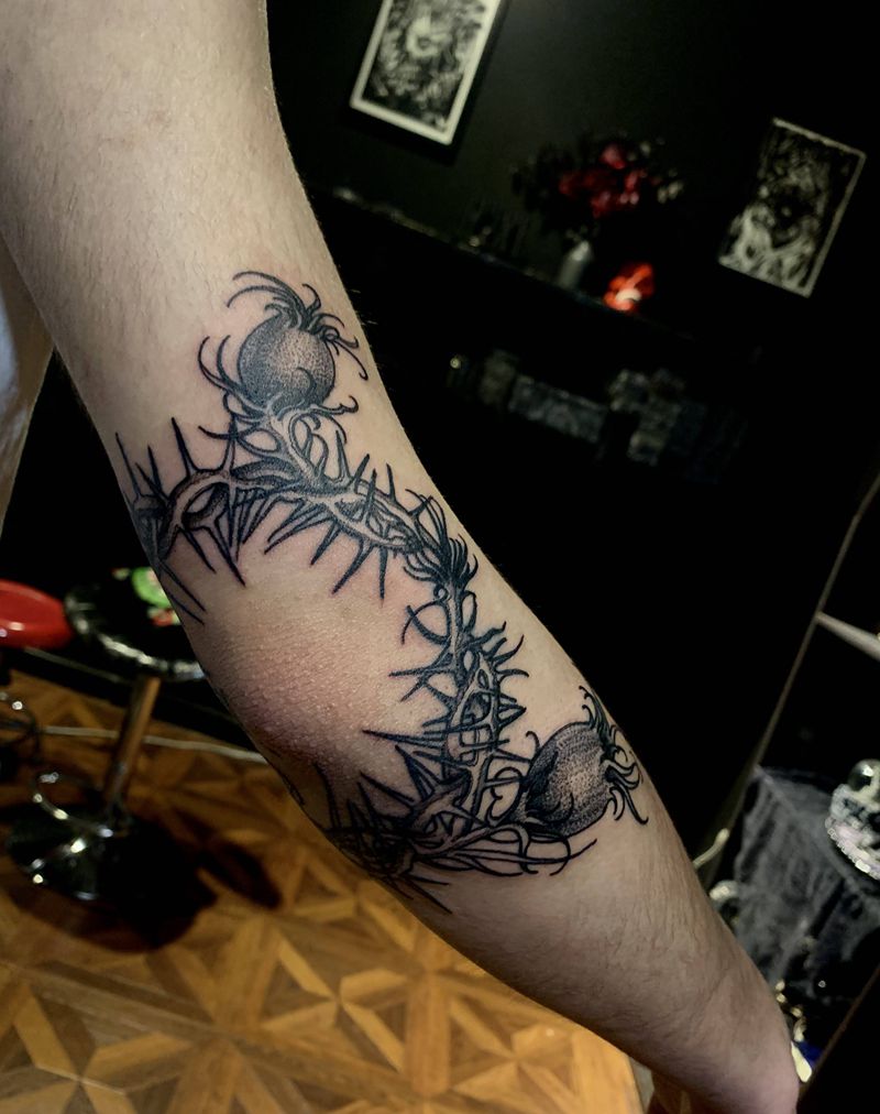 当前位置: 首页 >山西省太原市纹身店-霏刺青纹身图案>荆棘肘环纹身图片_手臂点刺纹身图案