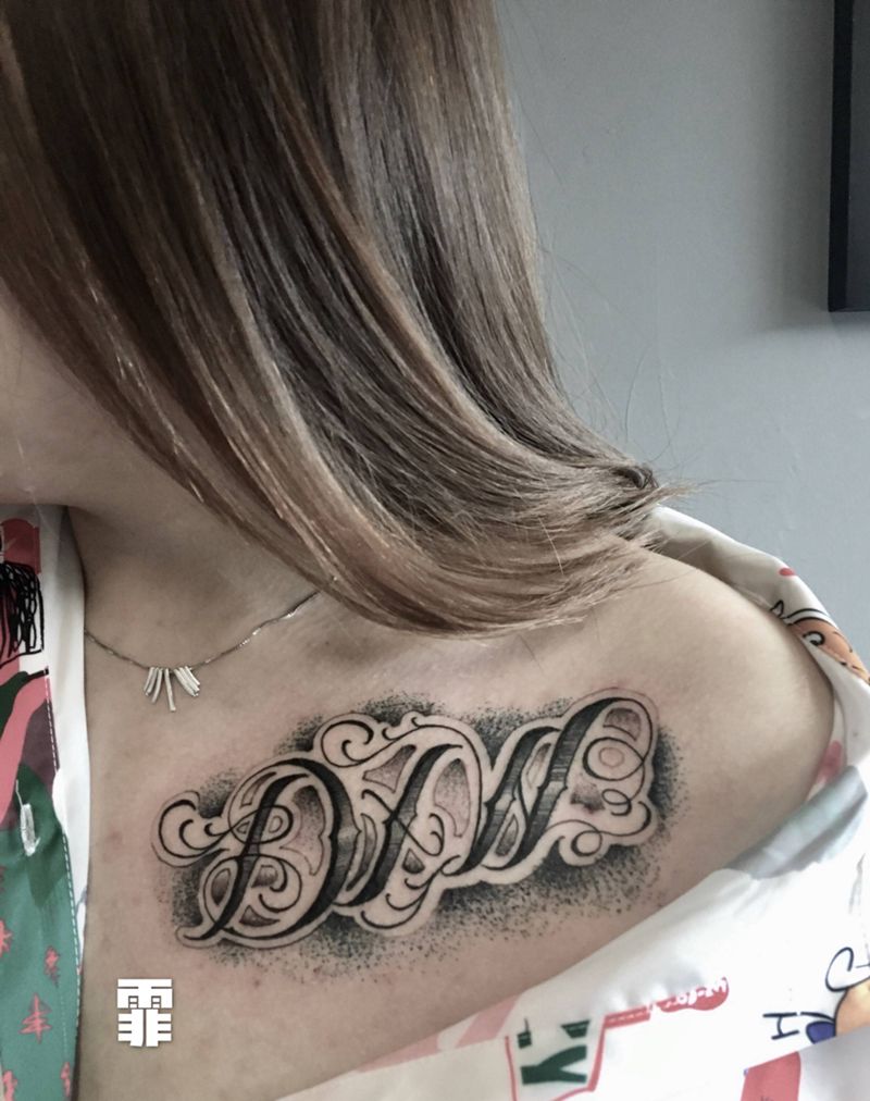软花体纹身图片_成品胸部欧美字符纹身图案